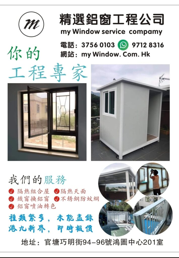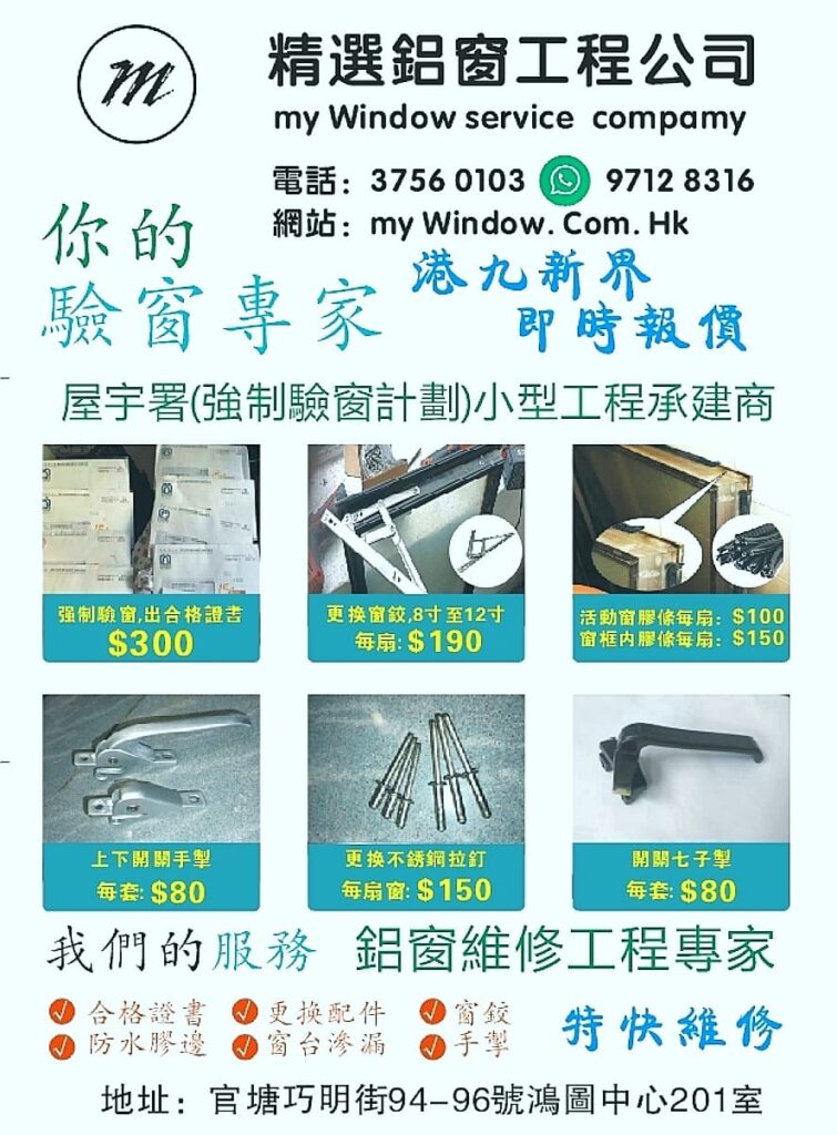 精選鋁窗工程公司 為客戶提供專業鋁窗維修服務,30年經驗,包括屋宇署強制驗窗計劃,合格證書,防水防漏工程,更換老化鋁窗配件,優質304不銹鋼窗鉸,開 關手制,防水隔音膠條,窗花,防蚊網,防寵物金鋼網,新造鋁窗等工程。